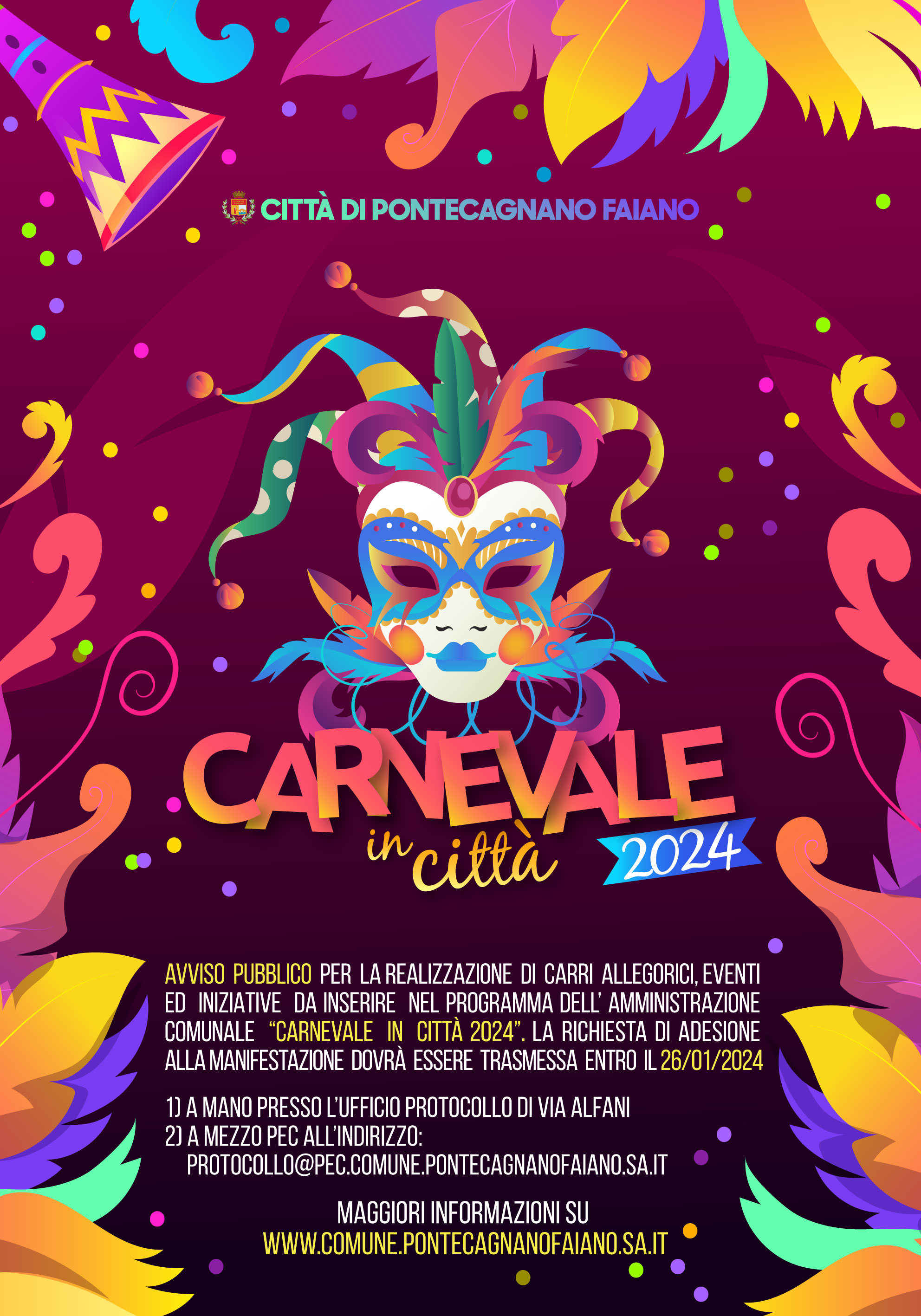 1. Il Comune di Pontecagnano Faiano, con il presente avviso, intende sollecitare manifestazioni di interesse da parte di soggetti (società, associazioni, oratori, enti, imprese, fondazioni, cooperative, consorzi, anche temporanei e istituzioni in genere, in qualunque forma costituite, pubbliche o private) che vogliono proporre la realizzazione di carri allegorici o iniziative per il “CARNEVALE in Città 2024”.