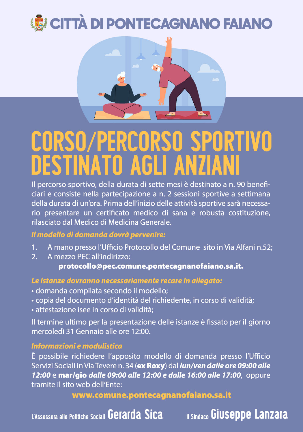 Il Settore Piano Sociale di Zona, Sevizi Sociali e Servizi Scolastici ha indetto un avviso pubblico per la partecipazione ad un corso/percorso sportivo destinato agli anziani residenti nel comune di Pontecagnano Faiano.