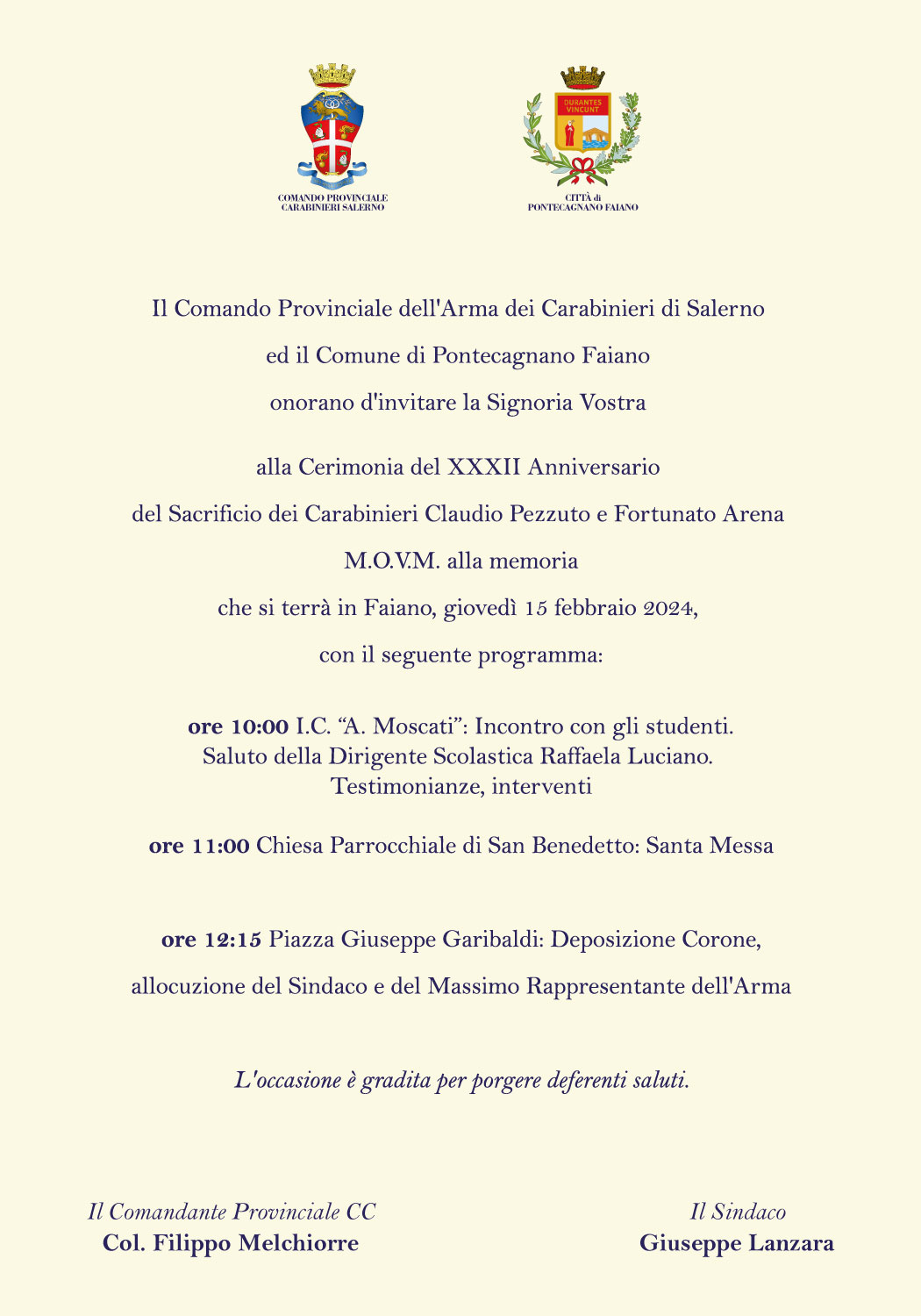 Saranno presenti il Comandante Provinciale dei Carabinieri di Salerno Colonnello Filippo Melchiorre, il Comandante della stazione locale Dario Santaniello, le vedove Angela Lampasona e Tania Pisani con il figlio Alessio.