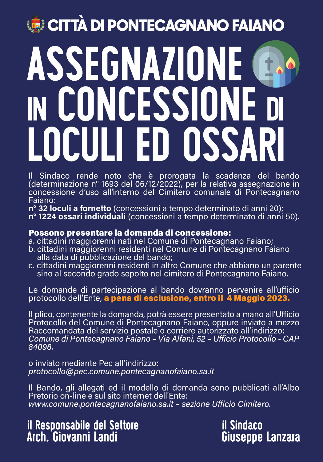 BANDO PUBBLICO PER L'ASSEGNAZIONE IN CONCESSIONE DI LOCULI ED OSSARI NEL CIMITERO COMUNALE DI PONTECAGNANO FAIANO (07/12/2022 - scadenza prorogata)